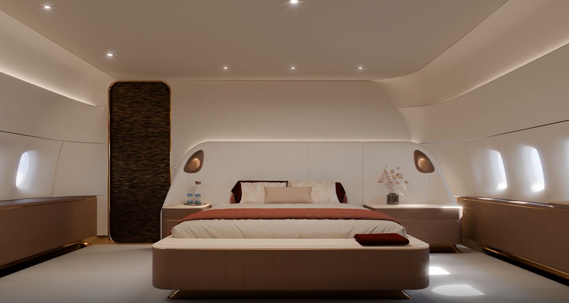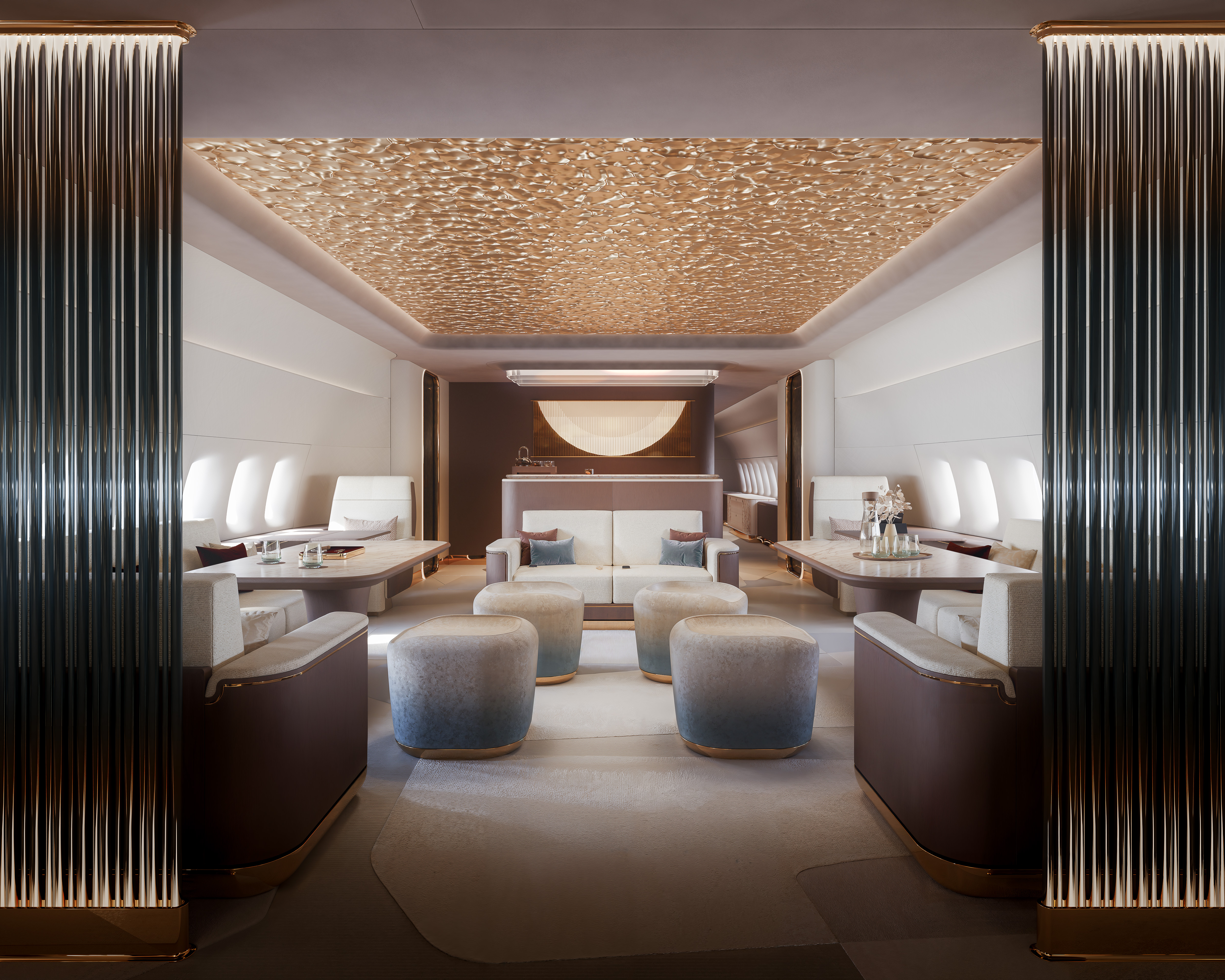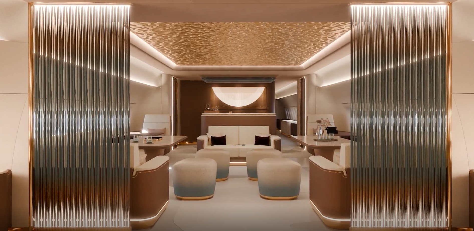 Jet Aviation’s Griffin concept cabin harmonizes soft, tactile curves and earthy, muted tones with the sleek precision of metallic finishes, creating a bold yet balanced contrast. Ambient lighting flows naturally throughout, offering a serene glow that enhances the cabin’s tranquil character. Every detail is curated to craft a distinctive, contemporary sanctuary, perfectly tailored to a customer’s individual needs and aesthetic.
