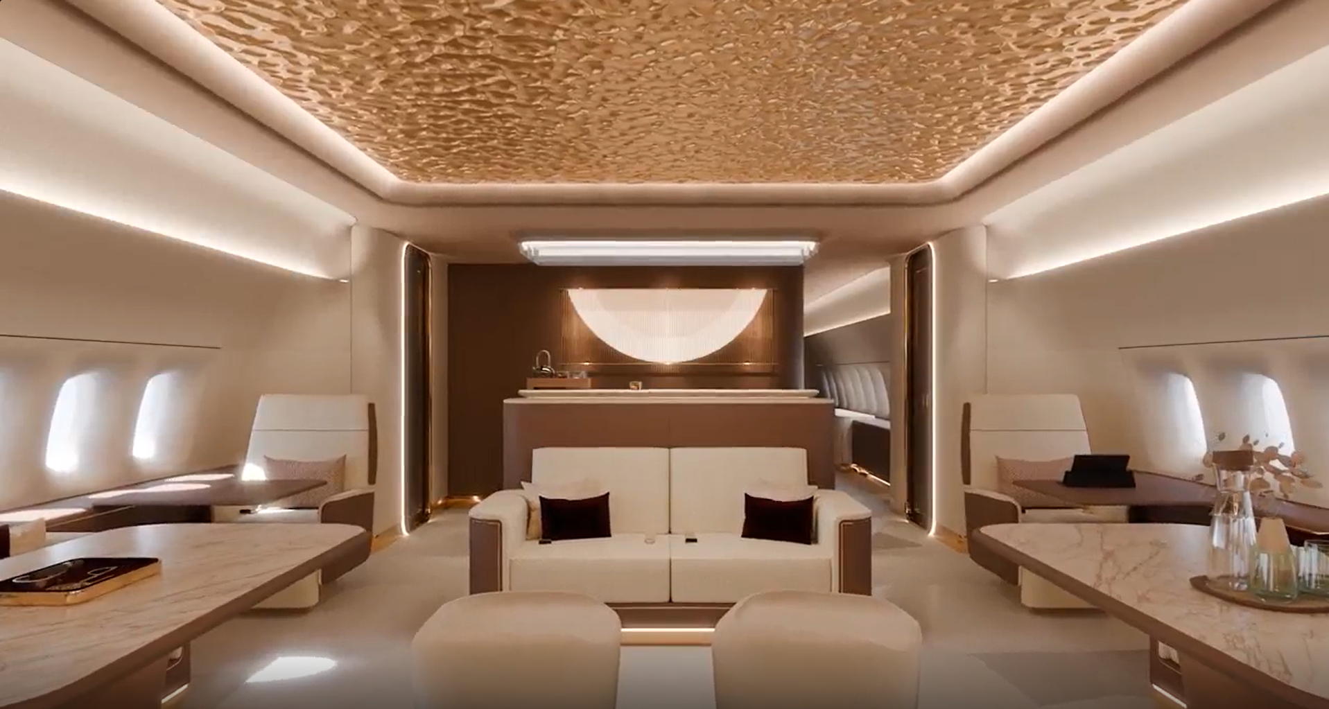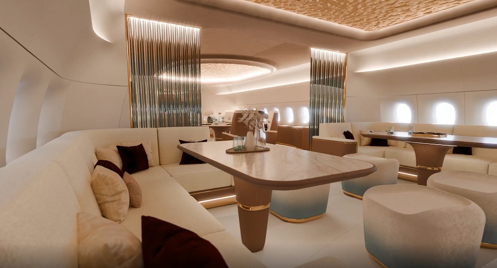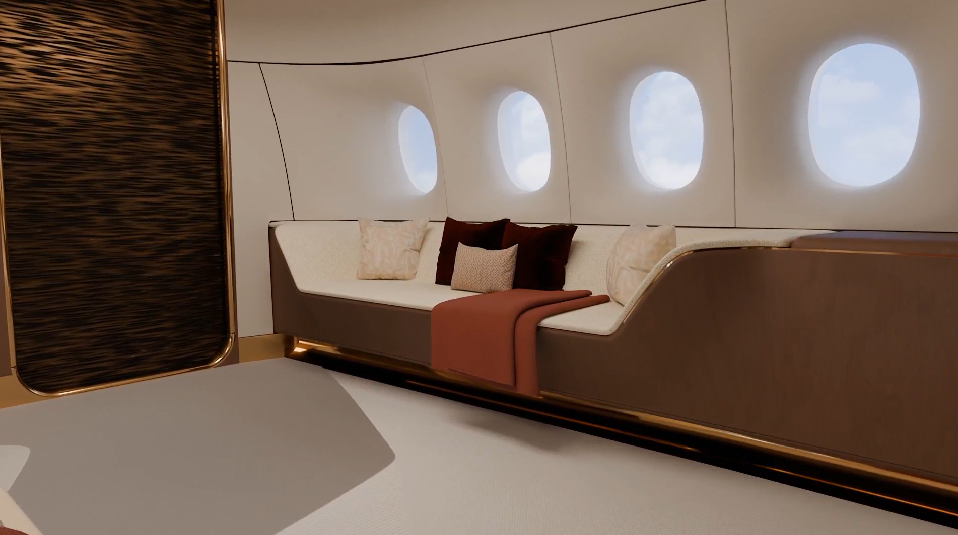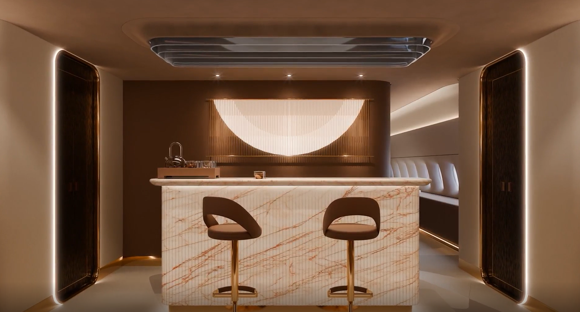 Jet Aviation’s Griffin concept cabin harmonizes soft, tactile curves and earthy, muted tones with the sleek precision of metallic finishes, creating a bold yet balanced contrast. Ambient lighting flows naturally throughout, offering a serene glow that enhances the cabin’s tranquil character. Every detail is curated to craft a distinctive, contemporary sanctuary, perfectly tailored to a customer’s individual needs and aesthetic.